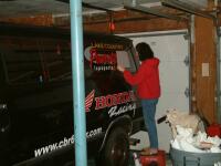 Next we went on to the larger, more complex logo of the Honda Racing. Again, we cut apart what we could and first installed the white background. The red overlay was much easier than expected. This was a piece which we were able to use water for. We peeled off the backing and squirted water on both the vinyl, contact paper and the logo already on the van. With this technique, you can constantly move the vinyl until it's in the perfect position. Then we squeegee'd the water out and allowed it to sit for about 30 minutes before VERY SLOWLY removing the contact paper. Again, this was a task which my wife had to do so I didn't destroy anything.